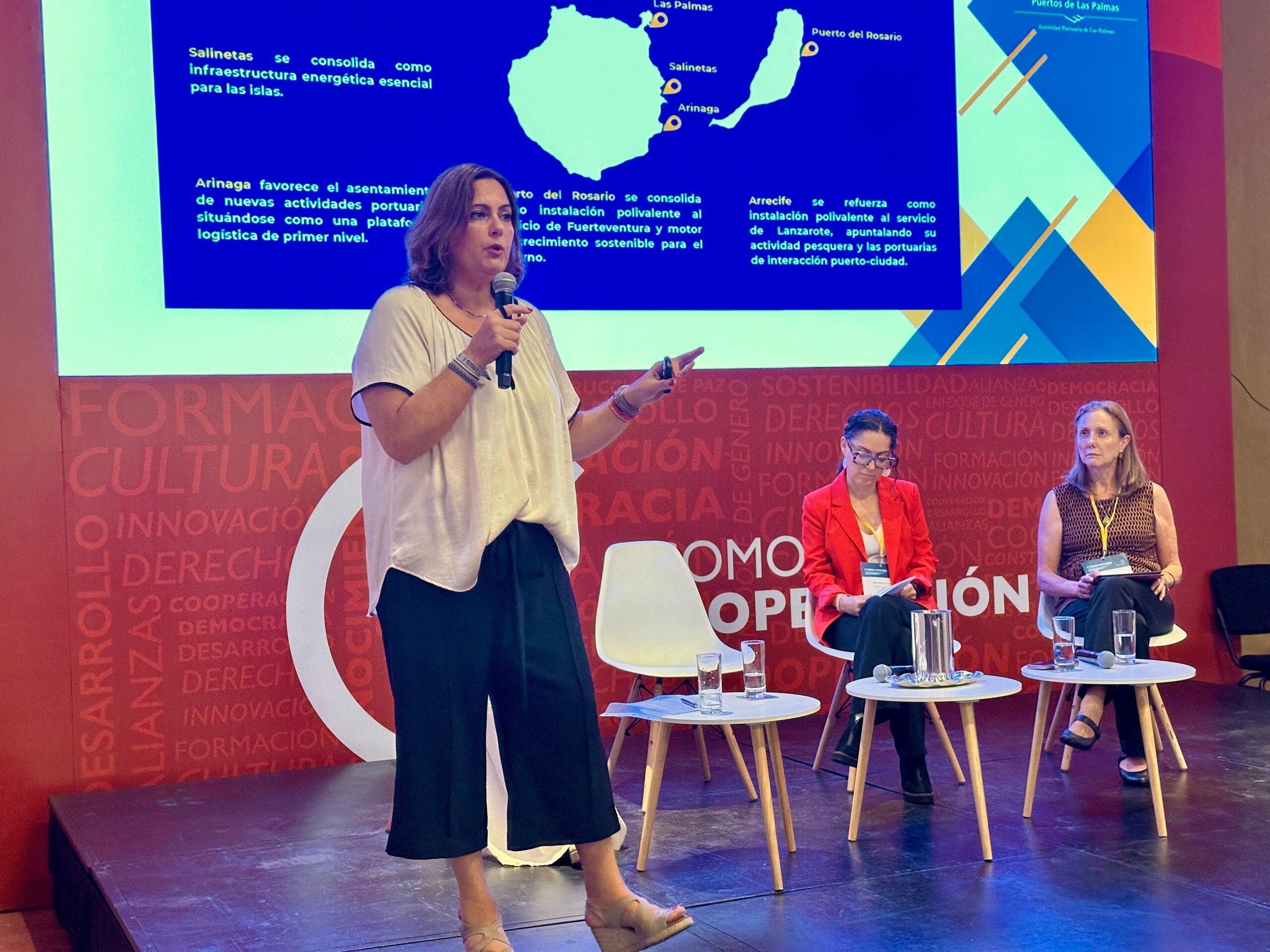 Durante su intervención, la presidenta de la Autoridad Portuaria de Las Palmas, Beatriz Calzada, participó en el panel ‘Puertos Innovadores e Inteligentes’, donde presentó la ponencia ‘Puertos Inteligentes’, centrada en la transformación digital, la sostenibilidad y la eficiencia en la gestión portuaria. Su intervención incluyó una exposición detallada sobre la evolución del sistema portuario provincial, la gobernanza eficiente, los avances en la electrificación de muelles y la integración de energías renovables. También presentó la hoja de ruta en sostenibilidad y digitalización de la Autoridad Portuaria, subrayando la cooperación entre los departamentos de Informática y Medio Ambiente para avanzar hacia un modelo de gestión inteligente y bajo en emisiones.